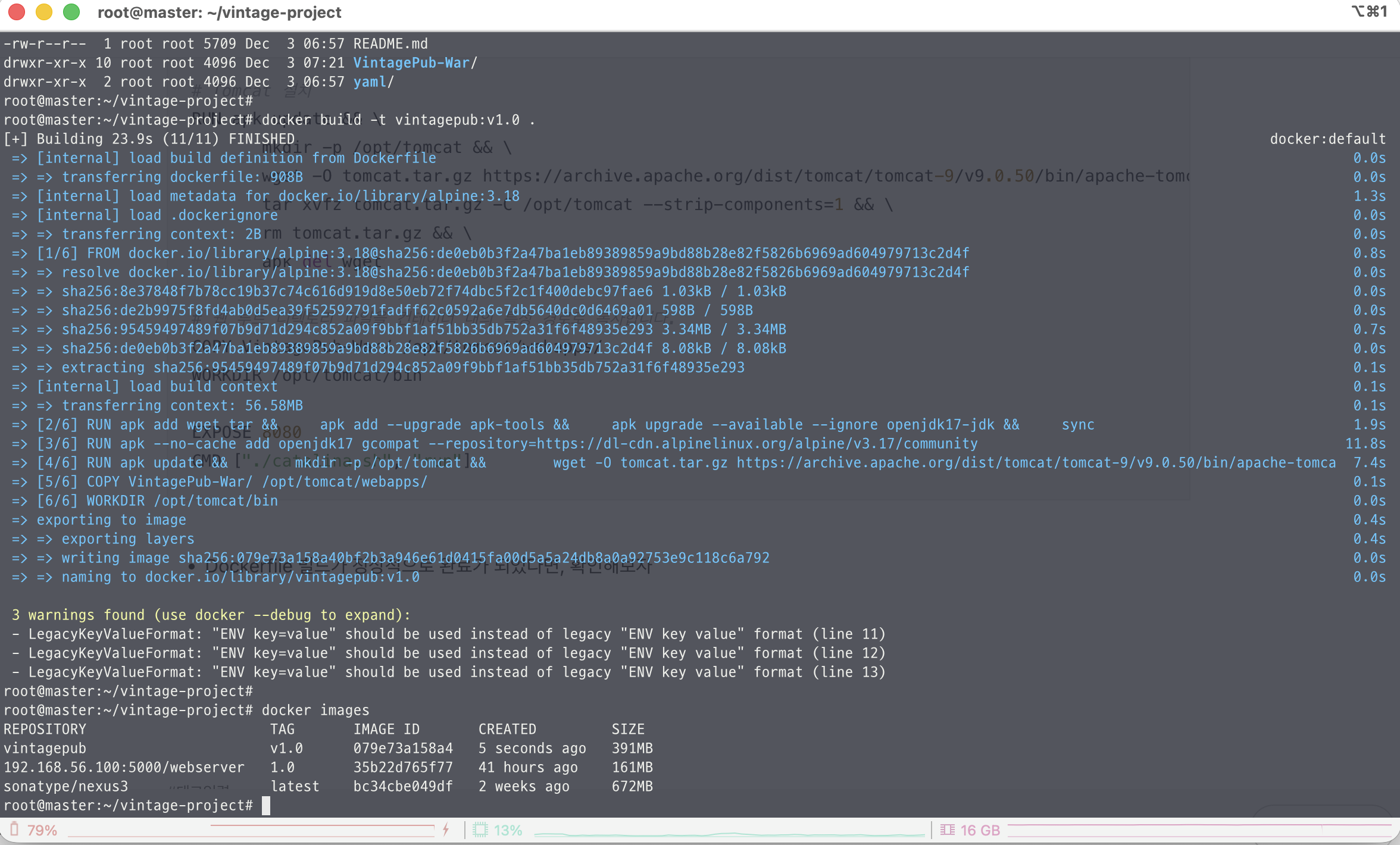 - 하기와 같이 Dockerfile을 작성하여 웹 서버 루트 디렉토리(vintage-project)에 위치한 후 빌드.