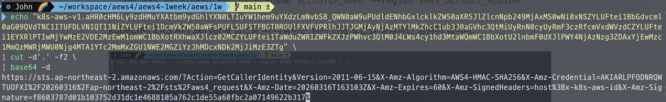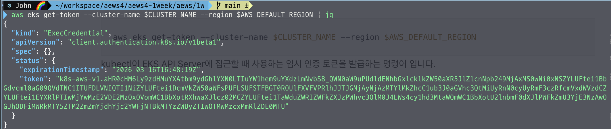 kubectl이 EKS API Server에 접근할 때 사용하는 임시 인증 토큰을 발급하는 명령어 입니다.