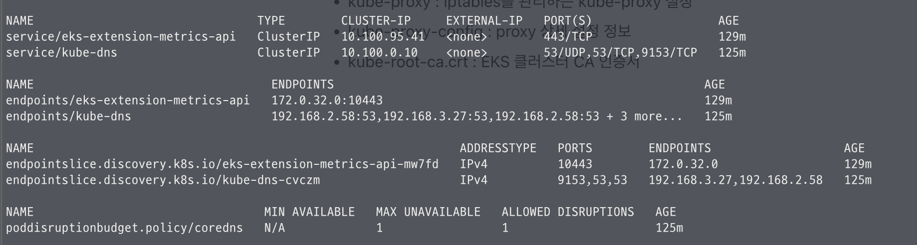 - CoreDNS is running 상태를 보아 클러스터 내부 DNS 서비스인 CoreDNS가 정상 동작을 의미.