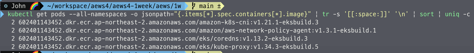 현재 가용중인 모든 파드들에 대한 컨테이너 이미지 정보를 확인해본 결과,