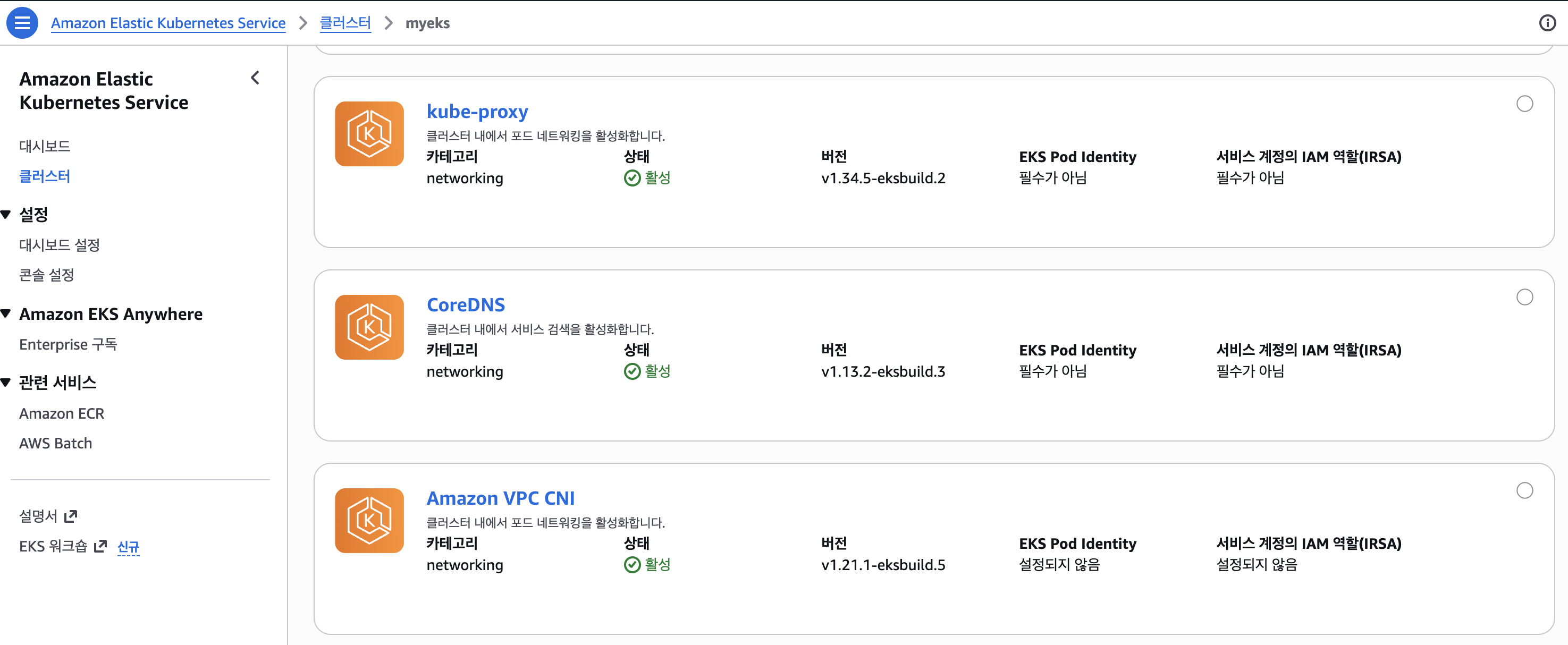 추가적으로 AWS Console → 클러스터 → 내 클러스터 선택 → 추가기능 에서도 확인이 가능합니다.
