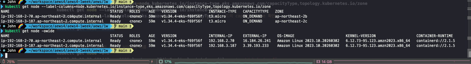 - 레이블 기반으로 노드 정보를 확인하였을 때 인스턴스 타입, 용량 유형, AZ를 확인할 수 있다.
