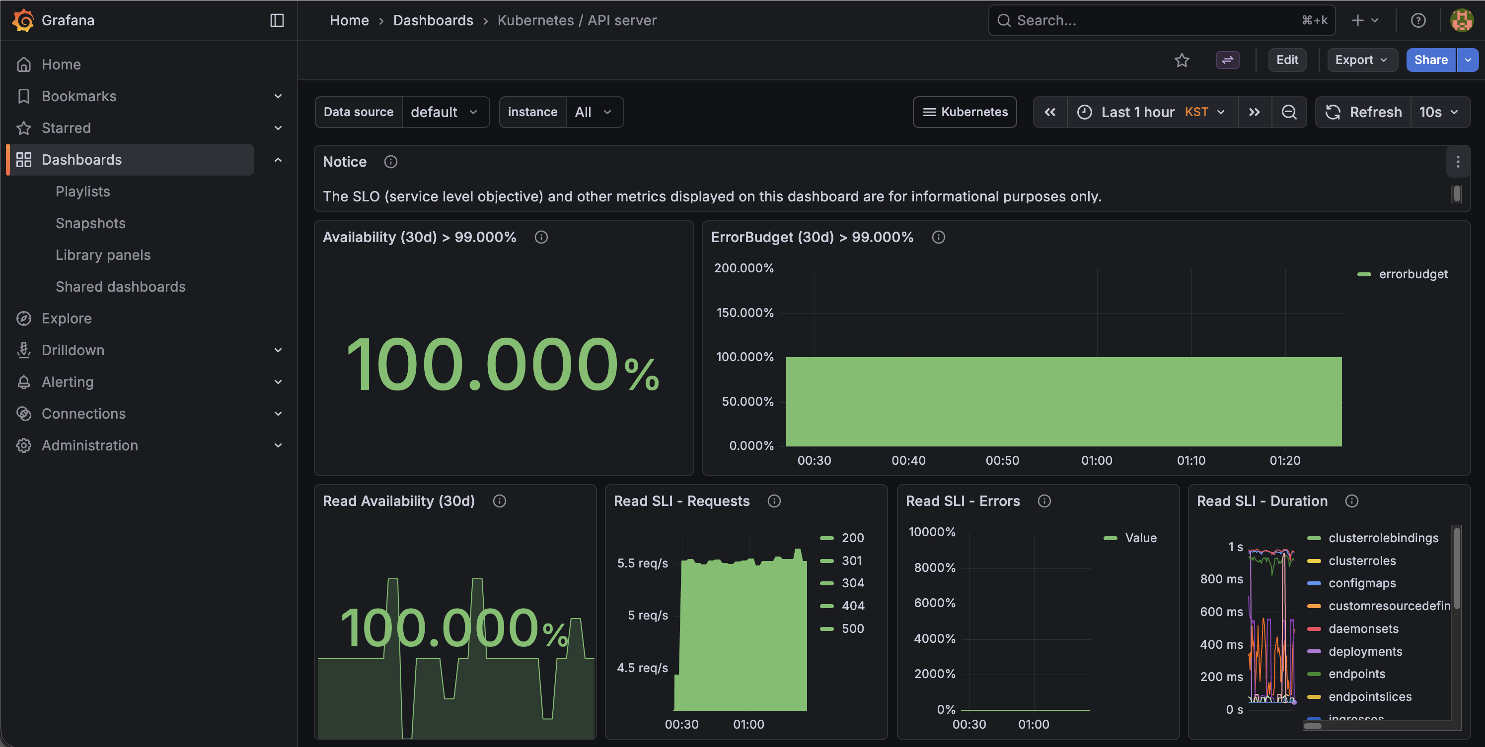 | Scheduling Duration p50/p90/p99 | 파드 1개 스케줄링하는데 걸리는 시간 분포. p99가 높으면 클러스터 부하 신호 |