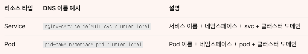 - 예를들어, nginx-service라는 이름의 service가 default 네임스페이스에 생성되었다면 Cluster 내부 DNS에서 nginx.-service.default.svc.cluster.local과 같은 FQDN이 생성된다.