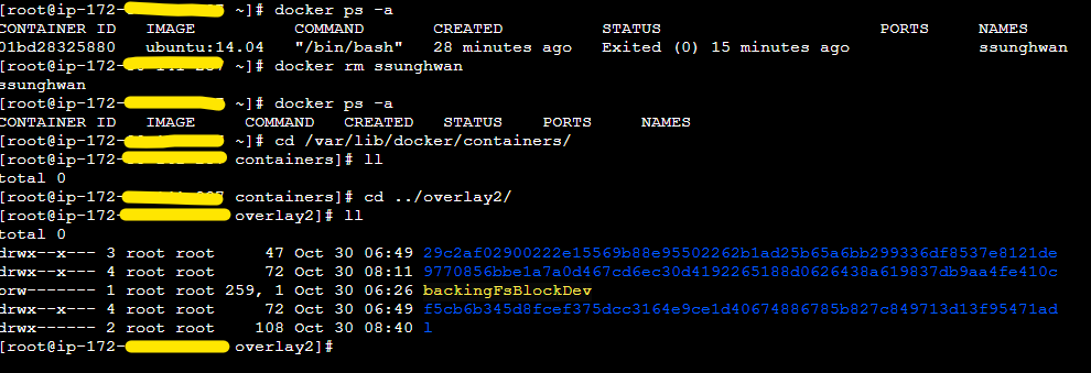 - /overlay2 디렉토리에 존재하던 writable layer 스냅샷이 삭제됨.