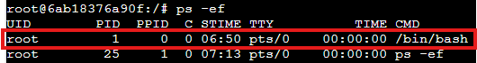 - PID 1이 /bin/bash인 이유는, docker run으로 container 생성 시 bash로 실행하였기 때문이다.