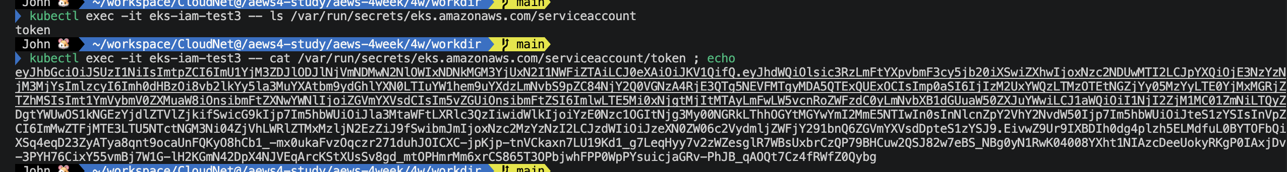 Pod 안에 K8S API 토큰이 없기 때문에 kubectl exec으로 파드 안에 들어가서 aws s3 ls 같은 걸 실행하는 건 가능하지만, kubectl 자체가 K8S API 서버와 통신할 때 쓰는 토큰과는 별개입니다.